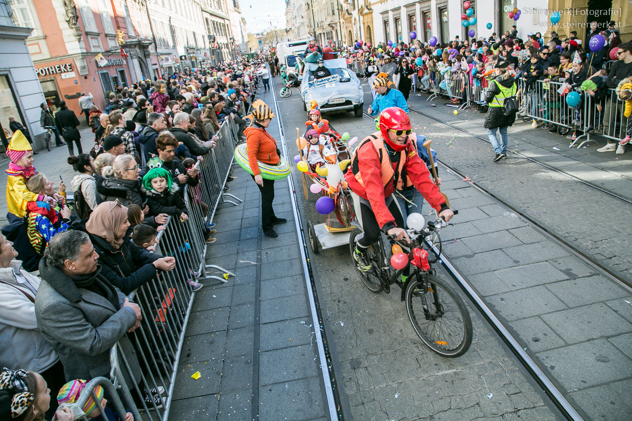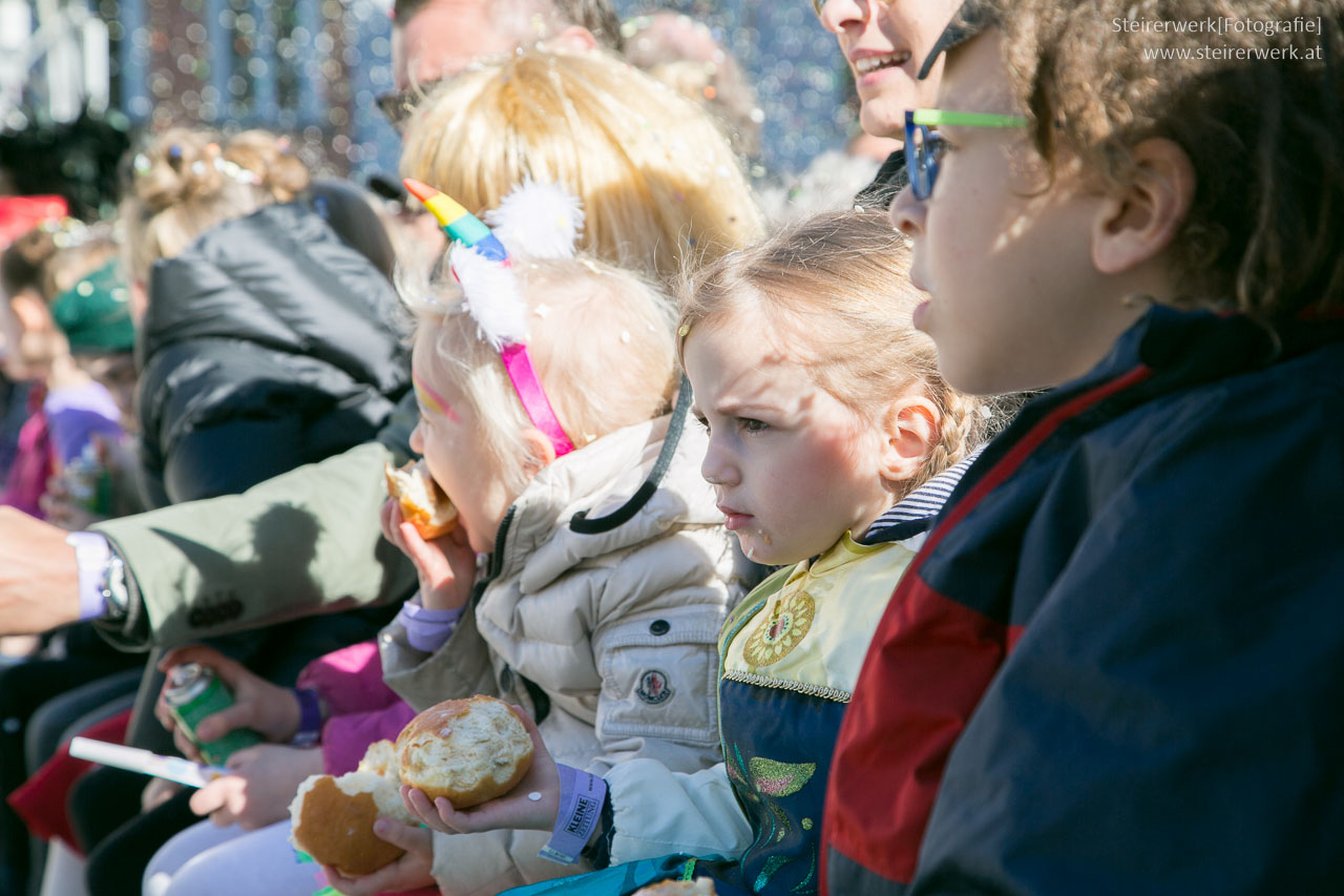 Am Nachmittag startet im Bermudadreieck die Faschingsparty. Während des ganzen Faschingszugs in der Herrengasse gibt es Gratiskrapfen, Musik- und Animationsgrupen, Luftballons sowie Tröten.