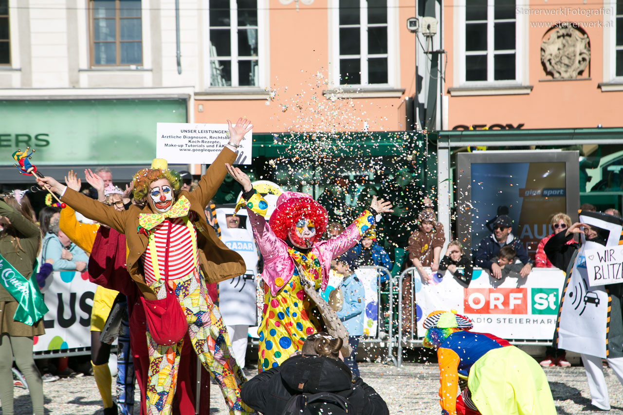 Der ORF überträgt den Faschingszug in Graz am Faschingsdienstag österreichweit live in ORF 2 sowie Tvthek ab 13.15 Uhr. Während der Übertragung werden alle Gruppen vorgestellt und interviewt. Moderatoren steuern amüsante Hintergrundinformationen, Wissenswertes über die Teilnehmer und Interessantes rund um die steirischen Faschingsbräuche bei.